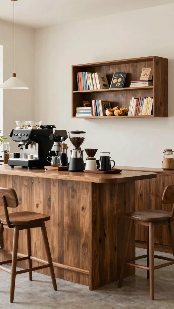 Make the most of your small space with a multi-functional coffee bar. This design not only serves as a coffee station but also incorporates areas for snacks or a small bookshelf to store your favorite reads. It encourages social interactions while remaining practical for everyday use.