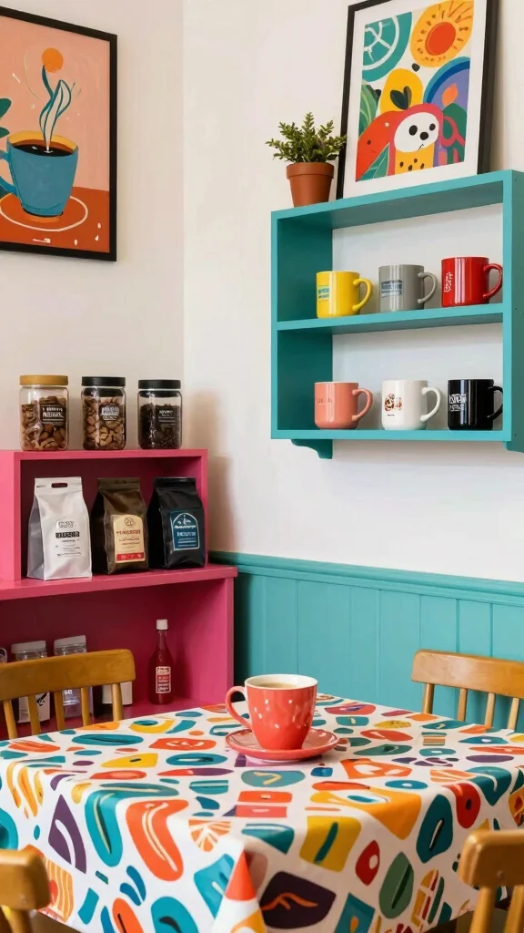 Brighten your coffee space with vibrant colors and cheerful decor that lifts your spirits. Choose vivid mugs and lively artwork to create an energetic atmosphere that makes every coffee moment special. This design invites joy and creativity into your daily routine.