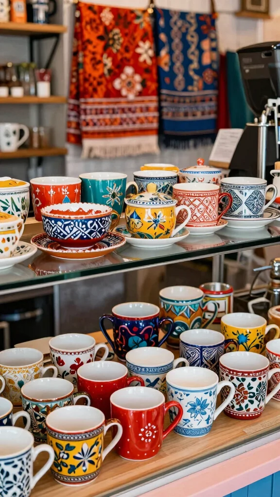 Organize colorful mugs on display for easy access.
