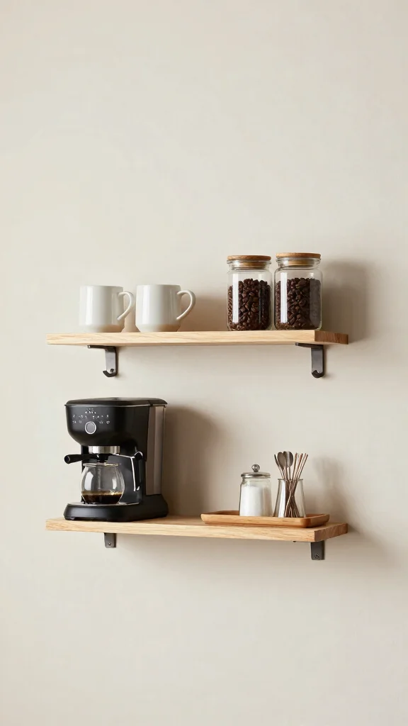 Struggling with limited counter space? A wall-mounted coffee bar could be your perfect solution. This innovative design maximizes vertical space while keeping your coffee essentials stylishly arranged. Floating shelves can hold everything you need, transforming your kitchen into a functional and trendy coffee area.