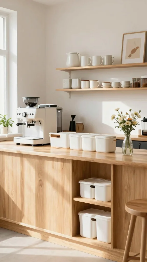 Experience the beauty of Scandinavian design with a simple yet functional coffee station. By focusing on light wood finishes and white accents, you create an airy environment that feels refreshing. This style emphasizes efficiency, ensuring all your coffee essentials are easily accessible.