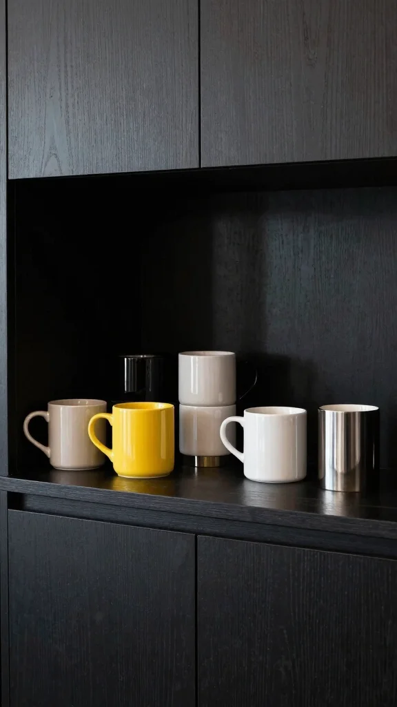 If you’re someone who loves bold statements, a high-contrast coffee bar will catch your attention. Pair dark elements, like black cabinets, with light-colored accessories to create a striking visual appeal. This modern setup not only looks stunning but also remains functional for your coffee needs.