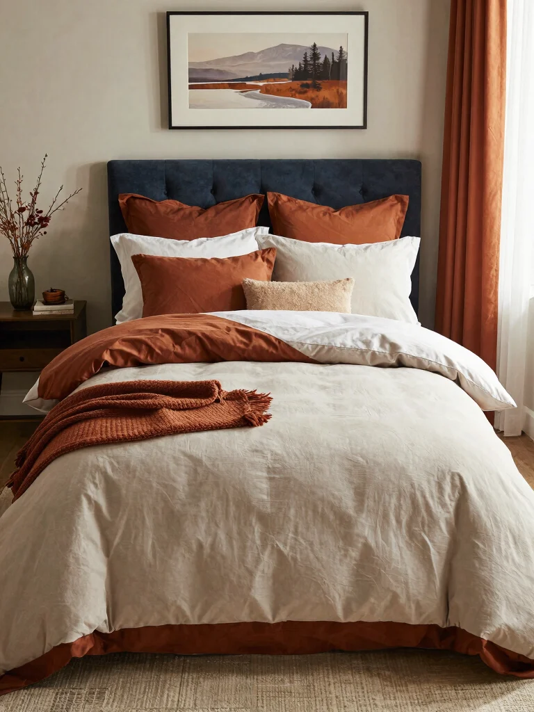 Earthy tones like terracotta, taupe, cream, olive, and rust work beautifully with textured layering to create warmth and depth. Start with a neutral base and introduce a warm color palettes for pillows, throws, and a duvet cover. Balance large textures with smaller patterns, and use metallic or natural accents sparingly to keep the look luxe rather than busy.
