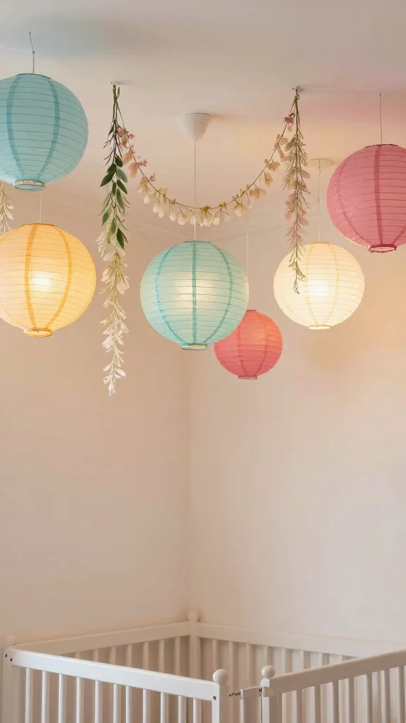 Consider hanging paper lanterns, vintage parachutes, or delicate garlands that sway gently, creating a charming visual effect. This unexpected decor element can elevate the nursery’s allure and offer your little one something delightful to gaze at while resting.