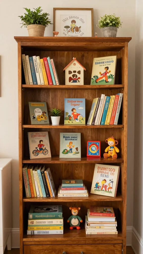 Include classic children’s books alongside vintage toys and personal treasures that narrate a story. This not only keeps your child’s favorite items within reach but also creates an eye-catching focal point in the room.