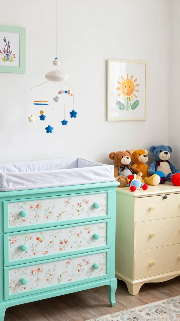Fun fact: Upcycled furniture can slash decor costs by 40%-60% while adding vintage baby room ideas charm. A dresser becomes a chic changing table with a pad, plus storage, when you refresh hardware.