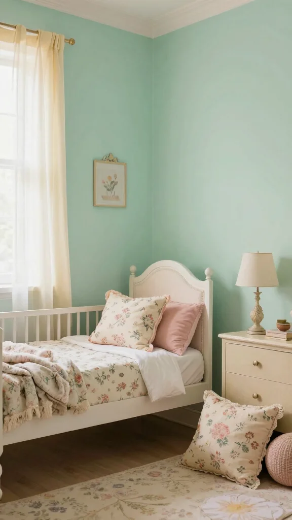 Soft mint greens, dusty pinks, and pale yellows evoke tranquility and charm, making the space feel inviting. Consider painting the walls in these soothing tones while coordinating furniture and decor to create a cohesive look. Vintage floral prints and stripes can further enhance the overall design, tying everything together harmoniously.