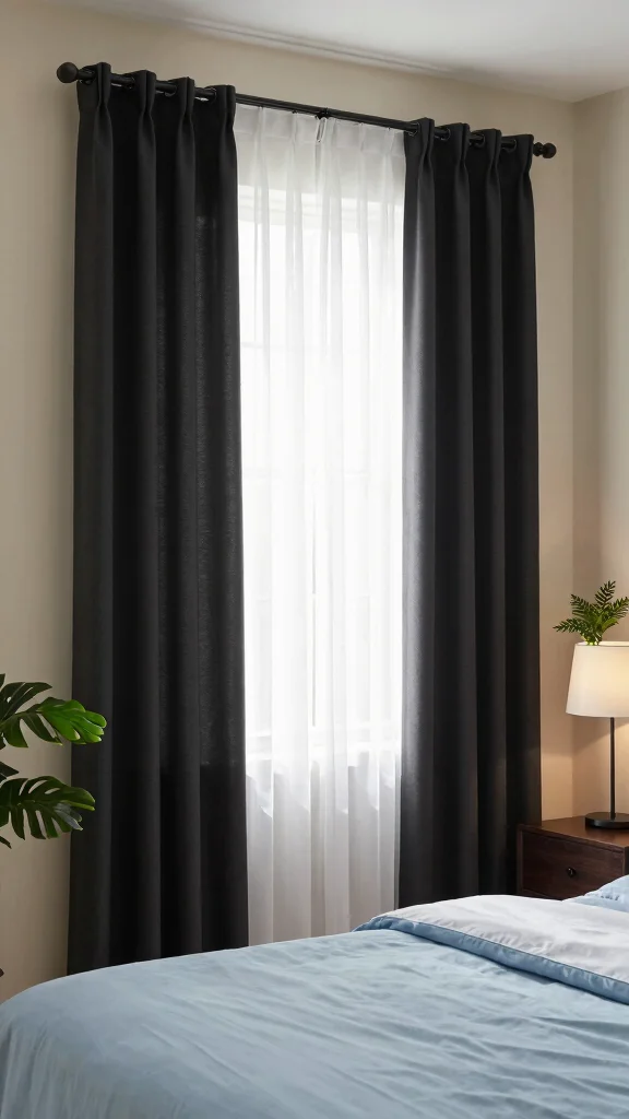 To implement this look, consider using a soft, breathable sheer fabric as your first layer, and heavy, insulating blackout curtains for added comfort. This setup not only enhances the room’s style but also aids in temperature control and light management.