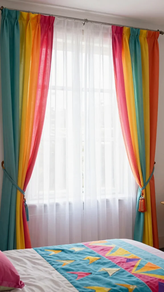 When the colorful drapes are closed, the sheer curtains continue to filter light beautifully, maintaining a bright atmosphere.