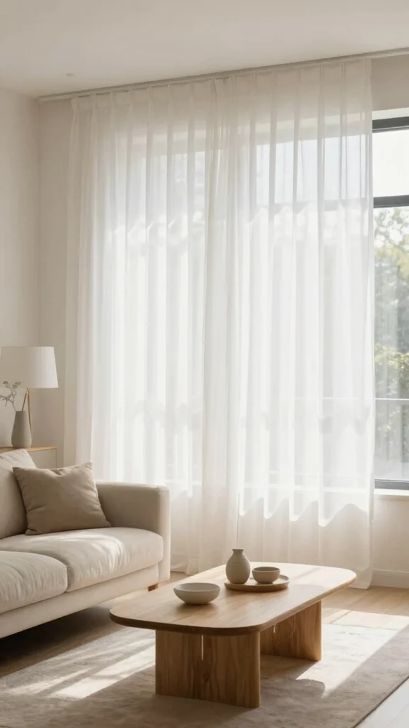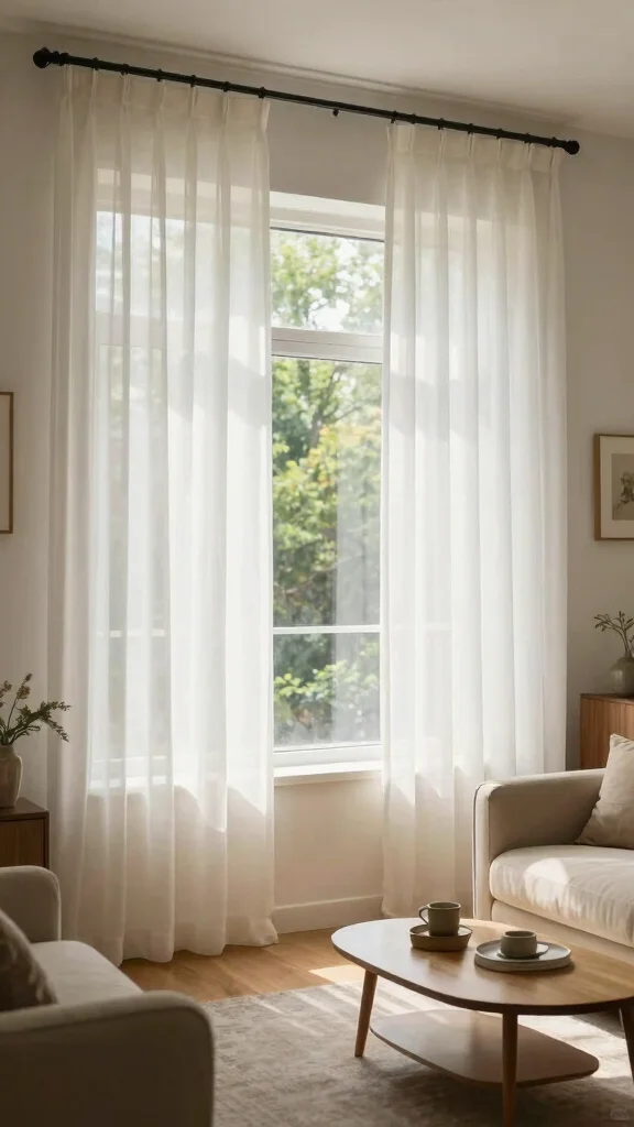 Styling the white sheer curtains living room in a small space is all about keeping things light and simple. Start with a slim, ceiling-height rod installed close to the wall to visually extend the height. Choose a single pair of lightweight window treatments panels in a breathable fabric and avoid heavy liners to maintain an open feel. Layer with a secondary shade or a very sheer liner if you need daytime privacy without losing the airy curtain designs. Stick to a calm, neutral palette to support modern living room decor and let the curtains do the light-diffusing work.