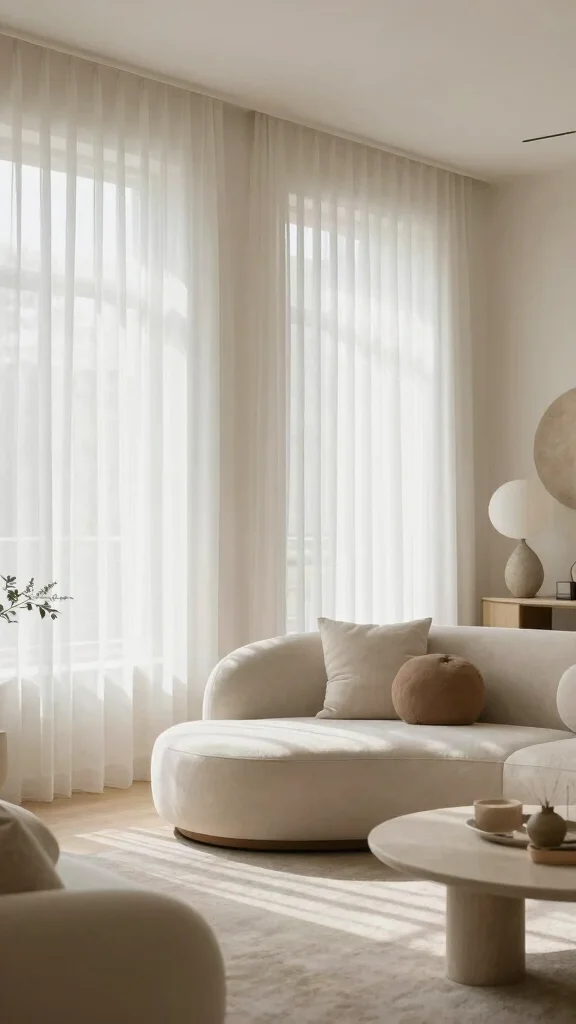 Keep decor minimal, choosing only a few carefully selected pieces that reflect your personal style. Allow the sheer curtains to stand out against a simple backdrop, and incorporate natural materials like wood or stone for warmth.