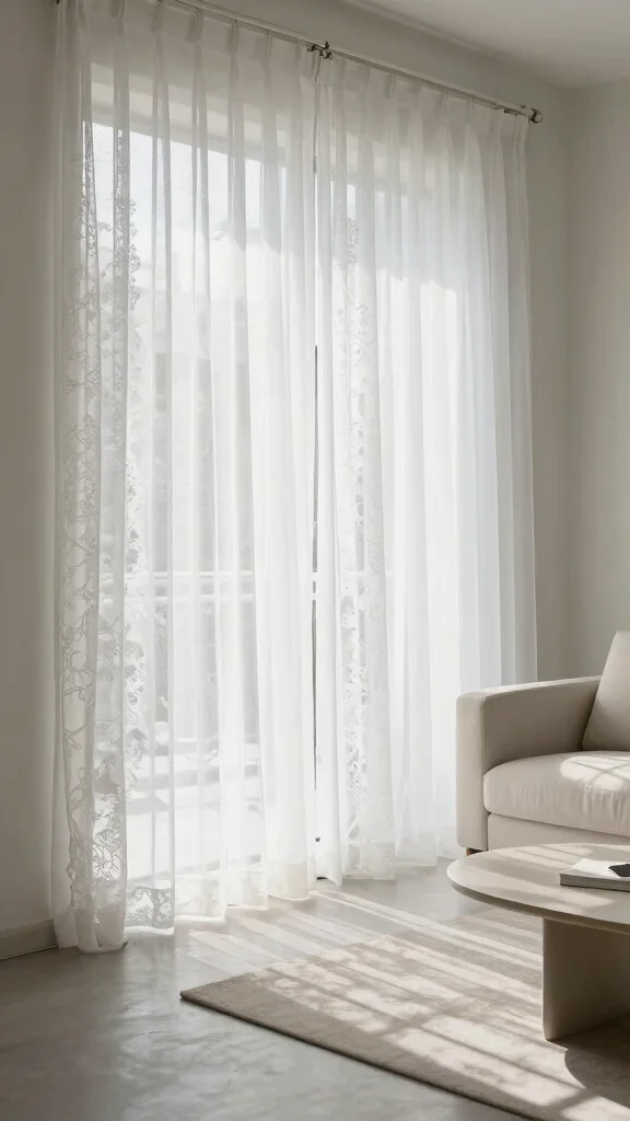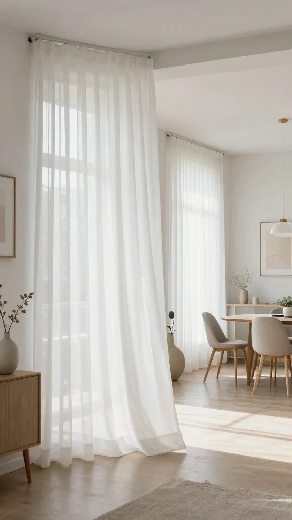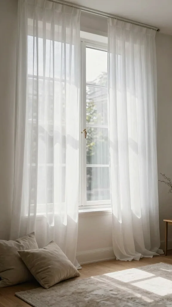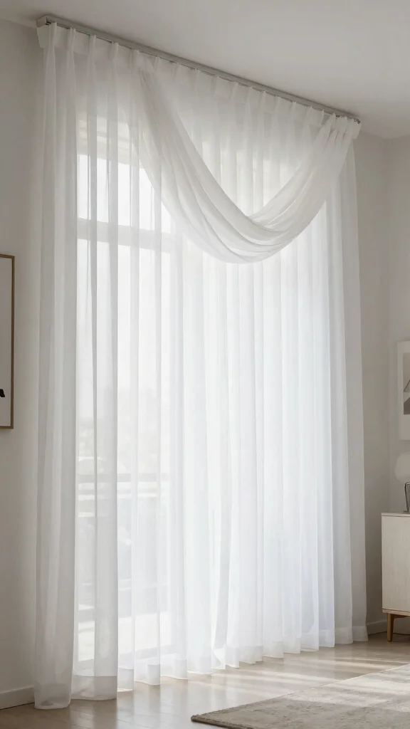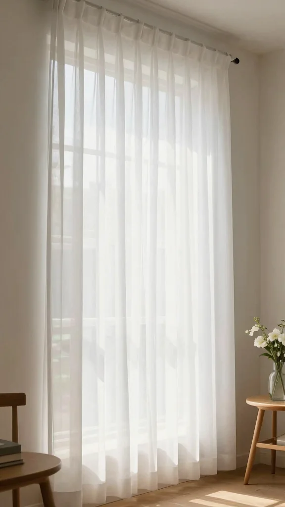 To enhance this effect, hang your sheer curtains high above the window frame. This simple adjustment can create the illusion of taller ceilings, making your room feel more expansive. Pair them with light-colored walls and minimal furnishings to amplify the airy atmosphere, or layer them with heavier drapes for added versatility—keeping them open during the day and closed at night for privacy.