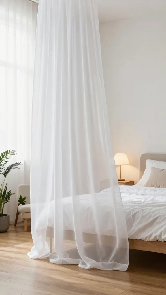 Opt for floor-length sheer curtains that gracefully pool on the floor, adding a touch of elegance. Pair them with simple bedding and minimal decor to maintain a clean aesthetic. Soft hues and natural materials can further promote tranquility, making the space feel serene.