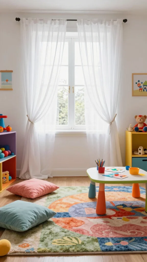 Hang sheer curtains over windows to allow plenty of natural light while still offering some privacy. Consider using colorful tiebacks or fun accents to add a playful touch. You can also use sheer curtains as dividers in a multi-functional playroom, giving each area a distinct purpose while keeping the space open and connected.